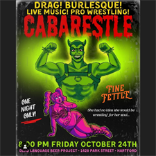 Get ready for suplexes, suspense, schlock and slams when CabaRestle returns to Dead Language Beer Project. CabaRestle is a unique blend of professional wrestling, theater, drag, burlesque and live music all in one event. Our eclectic lineup of wrestlers brings you freaks and geeks of all sorts, including a Broadway diva delivering show tunes and suplexes, a mummy straight from ancient Egypt, a home-maker hell-bent on ultra-violence, and a freakin' goat. They'll be joined by Paxx Headroom CT's living digital virus, the emo girl next door Miranda Darling, voted most likely to fall Clementine KuLayd, the spider ghoul of CT Arachne, the CT doll thing Dolling, mx chez comedy legend Rory Roux Lay, and burlesque a-go-go Vivienne LaFlamme.